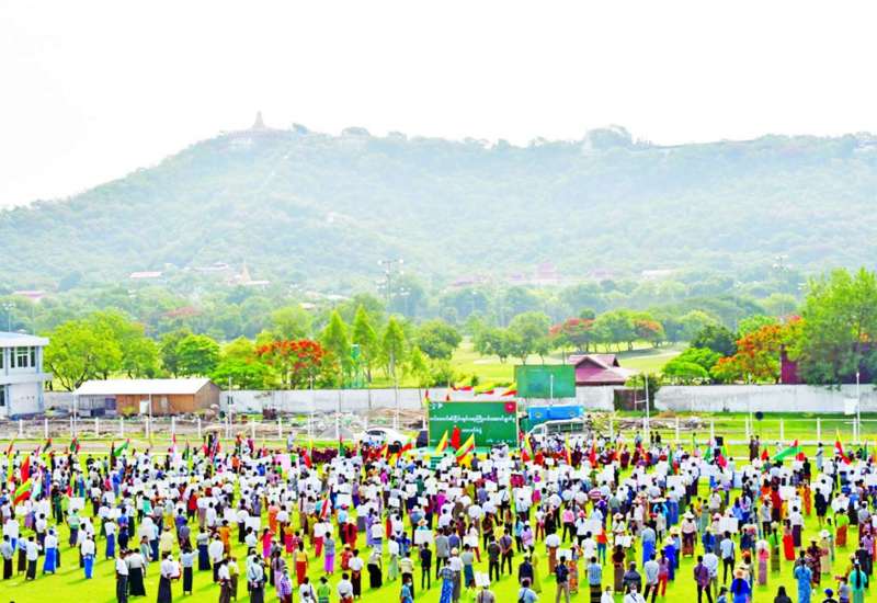 ပြည်ထောင်စုသမ္မတမြန်မာနိုင်ငံတော်အစိုးရ၊ နိုင်ငံတော်စီမံအုပ်ချုပ်ရေးကောင်စီဥက္ကဋ္ဌ နိုင်ငံတော်ဝန်ကြီးချုပ် ဗိုလ်ချုပ်မှူးကြီး မင်းအောင်လှိုင်၏ တိုင်းရင်းသားလက်နက်ကိုင် အဖွဲ့အစည်းများကို ငြိမ်းချမ်းရေး ဆွေးနွေးပွဲအတွက် ဖိတ်ခေါ်မှုကို ပြည်သူများက ကြိုဆိုထောက်ခံသည့်အနေဖြင့် ငြိမ်းချမ်းရေး ကြိုးပမ်းဆောင်ရွက်မှုလုပ်ငန်းများကို ကြိုဆိုထောက်ခံခြင်းနှင့် ပြည်ပစွက်ဖက် နှောင့်ယှက်မှုများအား ဆန့်ကျင်ရှုတ်ချပွဲကို ယနေ့နံနက်ပိုင်းတွင် မန္တလေးတိုင်းဒေသကြီး အောင်မြေသာစံမြို့နယ်ရှိ ရွှေမန်းတောင် အားကစားကွင်း၌ ပြုလုပ်သည်။