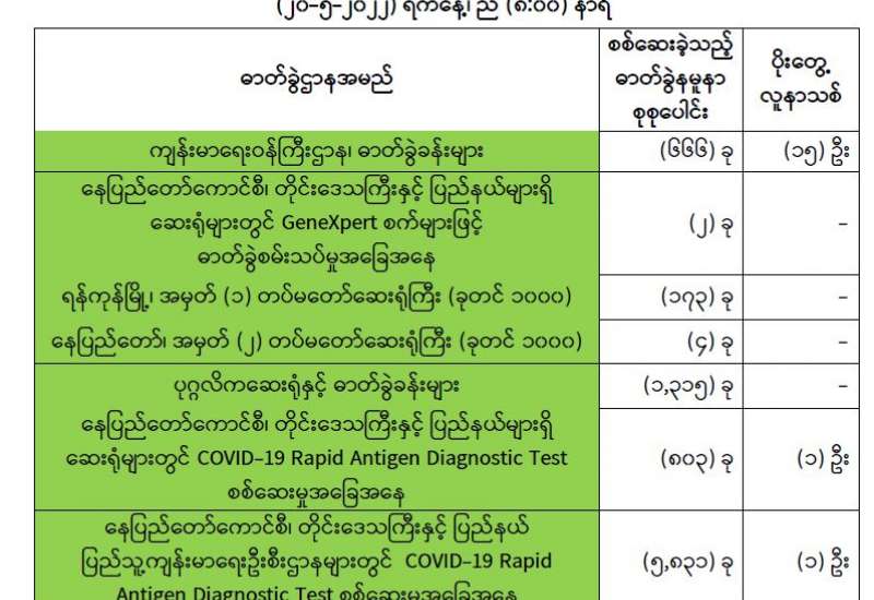 ကျန်းမာရေးဝန်ကြီးဌာနအနေဖြင့် နိုင်ငံအတွင်း ကူးစက်ဖြစ်ပွားနေသော COVID-19 ရောဂါ ကာကွယ်၊ ကုသ၊ ထိန်းချုပ်ရေးလုပ်ငန်းများကို အရှိန်အဟုန်မပျက် ဆောင်ရွက်လျက်ရှိပါသည်။