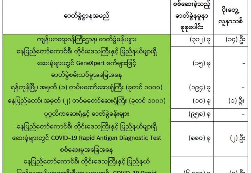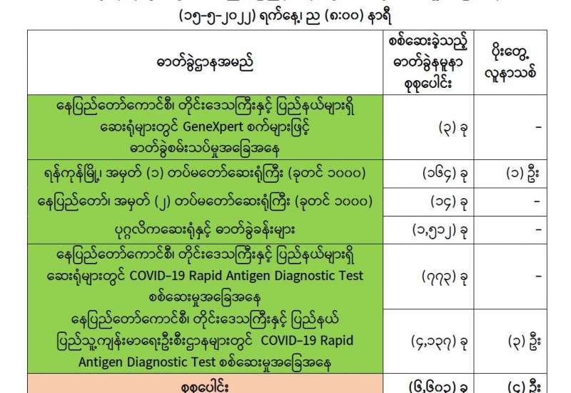 ကျန်းမာရေးဝန်ကြီးဌာနအနေဖြင့် နိုင်ငံအတွင်းကူးစက်ဖြစ်ပွားနေသော COVID-19 ရောဂါ ကာကွယ်၊ ကုသ၊ ထိန်းချုပ်ရေးလုပ်ငန်းများကို အရှိန်အဟုန်မပြတ် ဆောင်ရွက်လျက်ရှိပါသည်။