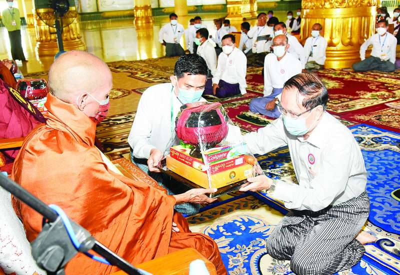 ဗုဒ္ဓဘာသာကလျာဏယုဝအသင်း (ဗဟို)က ကျင်းပသော မင်္ဂလာဆိုင်ရာဘွဲ့တံဆိပ်တော် ဆက်ကပ်လှူဒါန်းပွဲကို ယနေ့မွန်းလွဲပိုင်းတွင် ရန်ကုန်တိုင်းဒေသကြီး သာကေတမြို့နယ် အမှတ်(၁၀)ရပ်ကွက်ရှိ တိပိဋကာလင်္ကာရ ပရိယတ္တိစာသင်တိုက်၌ ကျင်းပရာ ရန်ကုန်တိုင်းဒေသကြီးဝန်ကြီးချုပ် ဦးစိုးသိန်း၊ ရန်ကုန်တိုင်းစစ်ဌာနချုပ် တိုင်းမှူးဗိုလ်ချုပ် ညွန့်ဝင်းဆွေနှင့် ဌာနဆိုင်ရာတာဝန်ရှိသူများ၊ စေတနာရှင်၊ အလှူရှင်များနှင့် ဖိတ်ကြားထားသူများ တက်ရောက်ကြသည်။