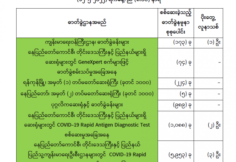 ကျန်းမာရေးဝန်ကြီးဌာနအနေဖြင့် နိုင်ငံအတွင်း ကူးစက်ဖြစ်ပွားနေသော COVID-19 ရောဂါ ကာကွယ်၊ ကုသ၊ ထိန်းချုပ်ရေးလုပ်ငန်းများကို အရှိန်အဟုန်မပြတ် ဆောင်ရွက်လျက် ရှိပါသည်။