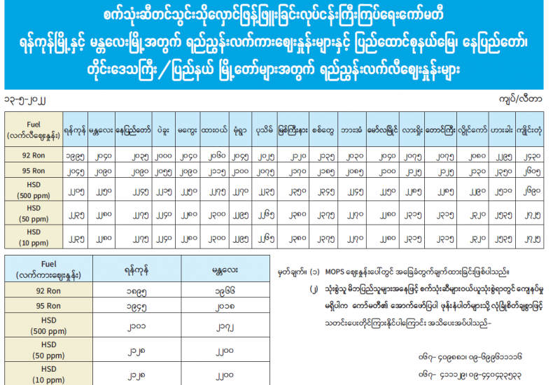 စက်သုံးဆီ တင်သွင်းသိုလှောင်ဖြန့်ဖြူးခြင်းလုပ်ငန်း ကြီးကြပ်ရေးကော်မတီ ရန်ကုန်မြို့နှင့် မန္တလေးမြို့အတွက် ရည်ညွှန်းလက်ကားဈေးနှုန်းများနှင့် ပြည်ထောင်စုနယ်မြေ၊ နေပြည်တော်၊ တိုင်းဒေသကြီး/ ပြည်နယ် မြို့တော်များအတွက် ရည်ညွှန်းလက်လီ ဈေးနှုန်းများ
