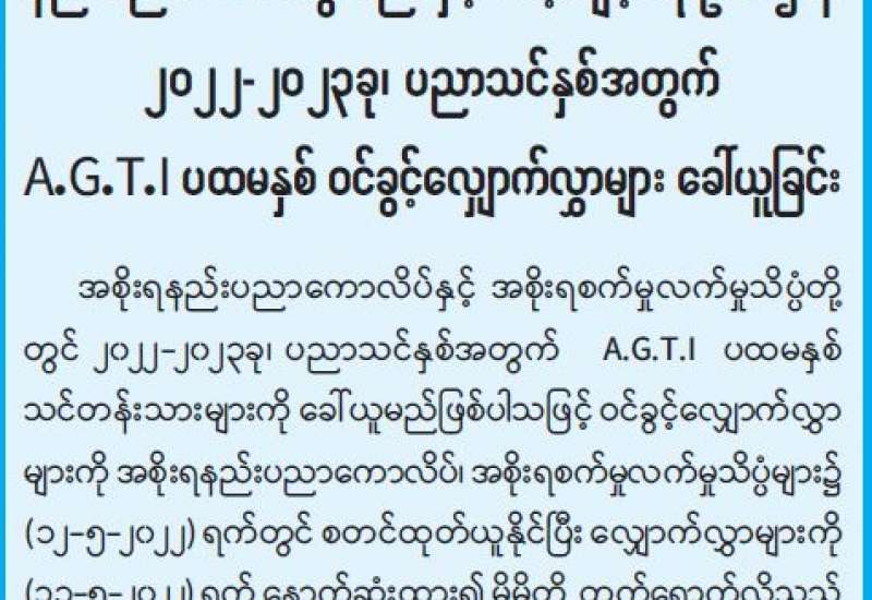 သိပ္ပံနှင့်နည်းပညာဝန်ကြီးဌာန နည်းပညာ၊ သက်မွေးပညာနှင့် လေ့ကျင့်ရေးဦးစီးဌာန ၂၀၂၂-၂၀၂၃ခု၊ ပညာသင်နှစ်အတွက် A.G.T.I ပထမနှစ် ဝင်ခွင့်လျှောက်လွှာများ ခေါ်ယူခြင်း