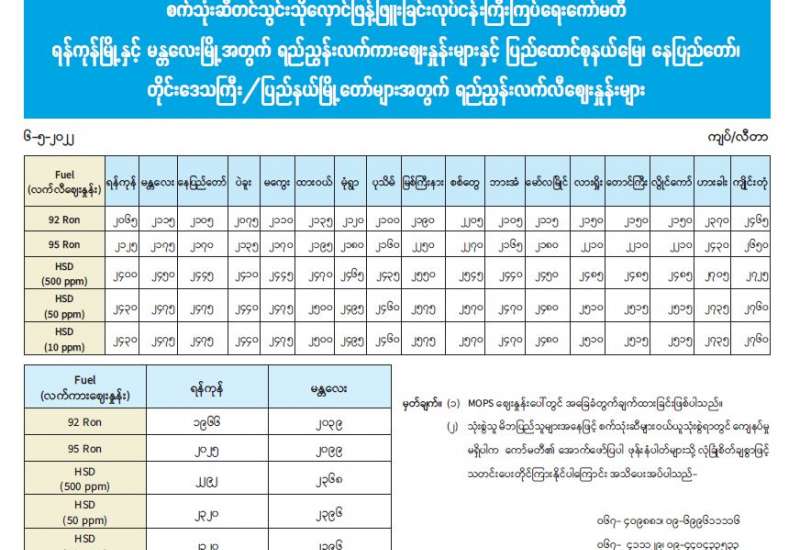 စက်သုံးဆီတင်သွင်းသိုလှောင်ဖြန့်ဖြူးခြင်းလုပ်ငန်းကြီးကြပ်ရေးကော်မတီ ရန်ကုန်မြို့နှင့် မန္တလေးမြို့ အတွက် ရည်ညွှန်းလက်ကားဈေးနှုန်းများနှင့် ပြည်ထောင်စုနယ်မြေ၊ နေပြည်တော်၊ တိုင်းဒေသကြီး/ ပြည်နယ်မြို့တော်များအတွက် ရည်ညွှန်းလက်လီဈေးနှုန်းများ