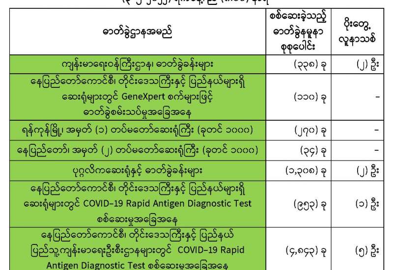 ကျန်းမာရေးဝန်ကြီးဌာနအနေဖြင့် နိုင်ငံအတွင်း ကူးစက်ဖြစ်ပွားနေသော COVID-19 ရောဂါ ကာကွယ်၊ ကုသ၊ ထိန်းချုပ်ရေးလုပ်ငန်းများကို အရှိန်အဟုန်မြှင့်ဆောင်ရွက်လျက်ရှိပါသည်။