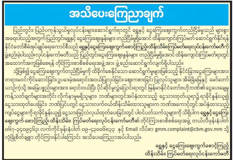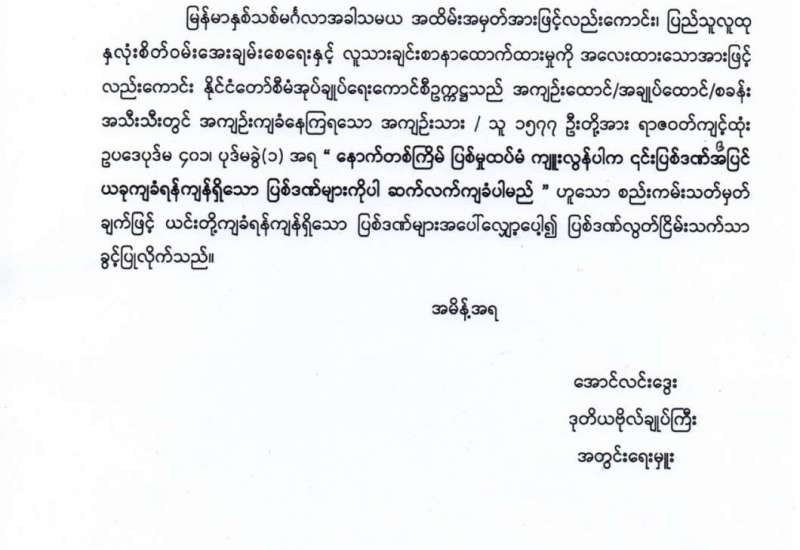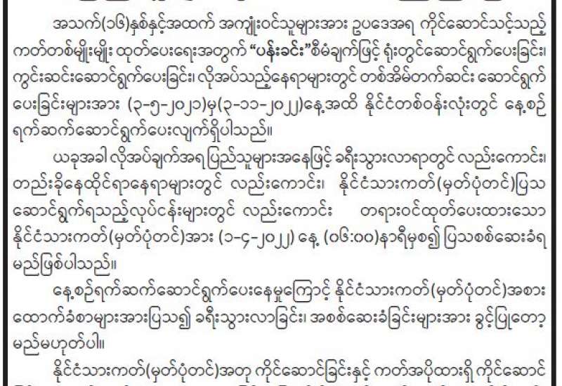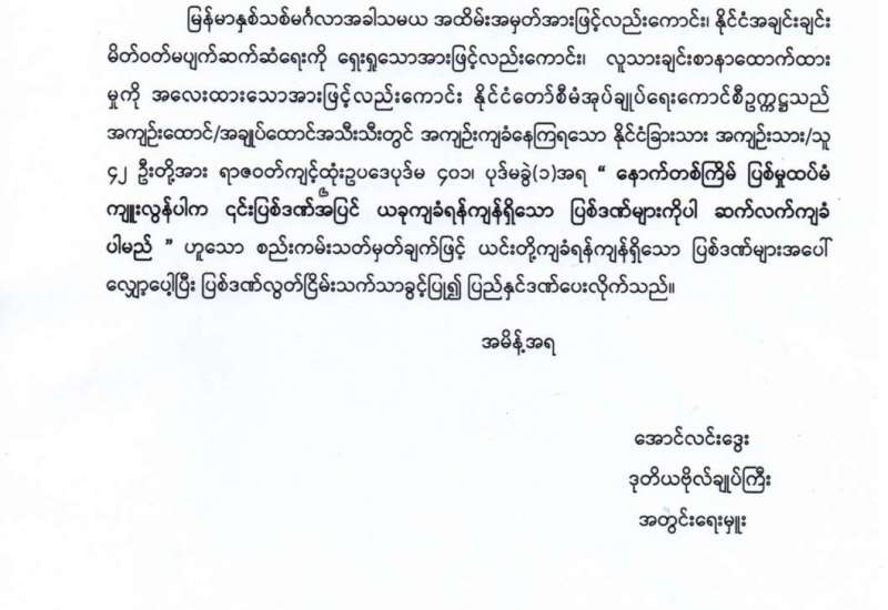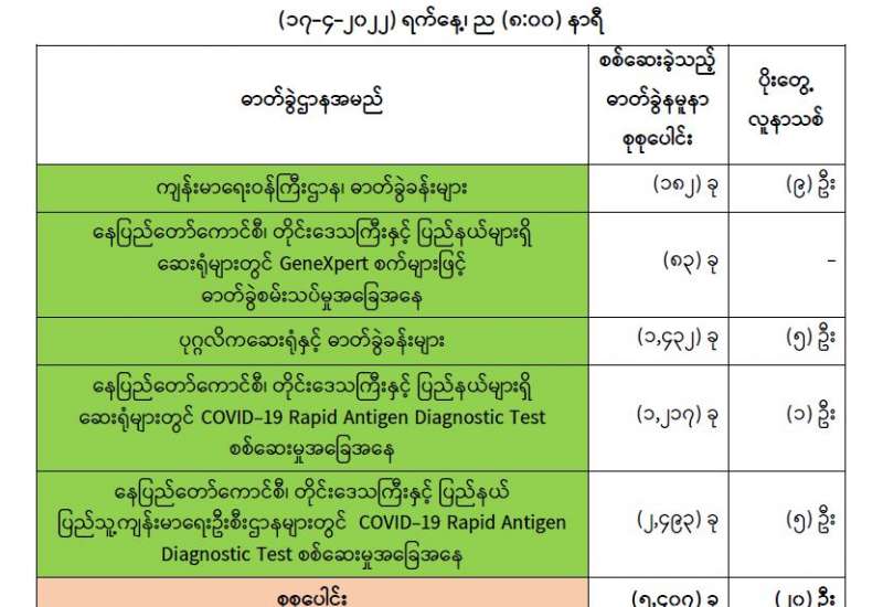 ကျန်းမာရေးဝန်ကြီးဌာနအနေဖြင့် နိုင်ငံအတွင်း ကူးစက်ဖြစ်ပွားနေသော COVID-19 ရောဂါ ကာကွယ်၊ ကုသ၊ ထိန်းချုပ်ရေးလုပ်ငန်းများကို အရှိန်အဟုန်မြှင့်ဆောင်ရွက်လျက်ရှိရာ ရောဂါထိန်းချုပ်ရေးလုပ်ငန်းများ အောင်မြင်နိုင်ရေးအတွက် ပြည်သူလူထုအနေဖြင့် ကျန်းမာရေးဝန်ကြီးဌာနမှ ထုတ်ပြန်ထားသော COVID-19 ရောဂါကာကွယ်ထိန်းချုပ်ရေးဆိုင်ရာ စည်းကမ်းများကို စနစ်တကျ လိုက်နာ ဆောင်ရွက်ရန် လိုအပ်ပြီး COVID-19 ကာကွယ်ဆေးထိုးနှံမှုခံယူခြင်းအား အထူးဂရုပြု ပူးပေါင်းဆောင်ရွက်ကြရန် လိုအပ်ပါသည်။