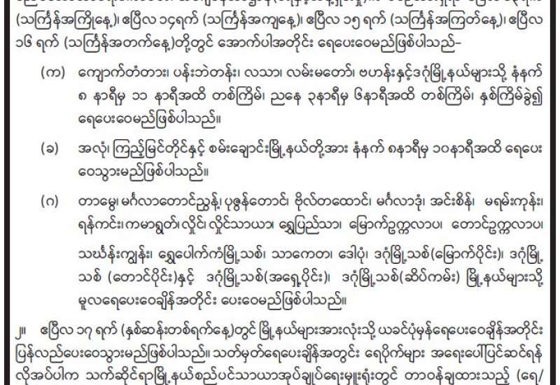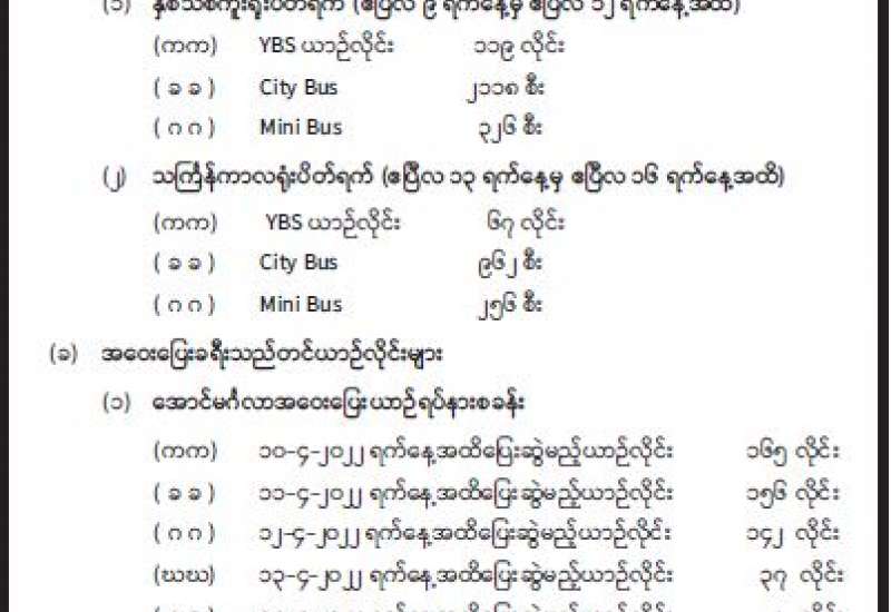 ၂၀၂၂ ခုနှစ်၊ နှစ်သစ်ကူးရုံးပိတ်ရက်နှင့် သင်္ကြန်ကာလ ရုံးပိတ်ရက်ကာလအတွင်း YBS ယာဉ်လိုင်းများ၊ အဝေးပြေးယာဉ်လိုင်းများ ပြေးဆွဲမည့်အစီအစဉ်အား အသိပေးကြေညာခြင်း