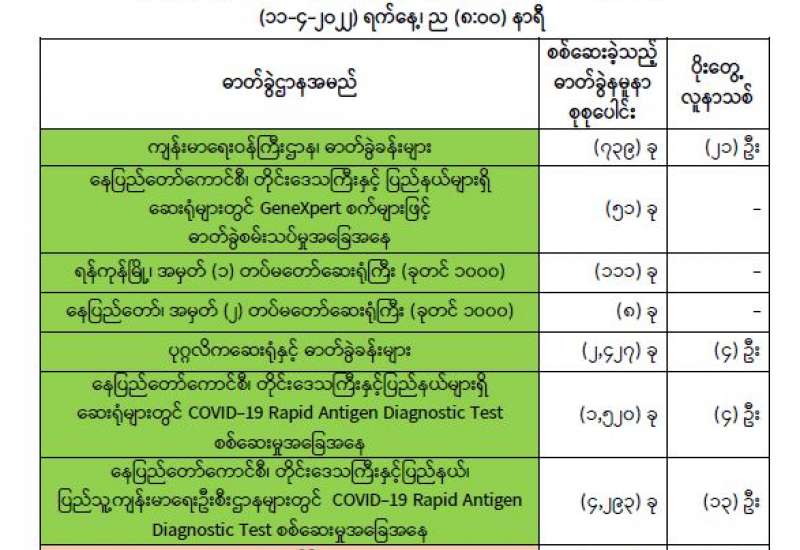 ကျန်းမာရေးဝန်ကြီးဌာနအနေဖြင့် နိုင်ငံအတွင်း ကူးစက်ဖြစ်ပွားနေသော COVID-19 ရောဂါ ကာကွယ်၊ ကုသ၊ ထိန်းချုပ်ရေးလုပ်ငန်းများကို အရှိန်အဟုန်မြှင့်ဆောင်ရွက်လျက်ရှိပါသည်။
