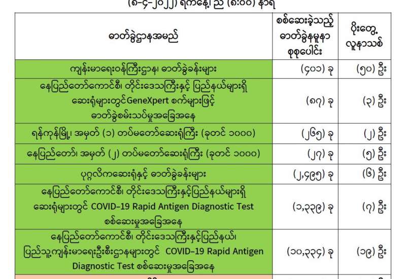 ကျန်းမာရေးဝန်ကြီးဌာနအနေဖြင့် နိုင်ငံအတွင်း ကူးစက်ဖြစ်ပွားနေသော COVID-19 ရောဂါ ကာကွယ်၊ ကုသ၊ ထိန်းချုပ်ရေးလုပ်ငန်းများကို အရှိန်အဟုန်မြှင့်ဆောင်ရွက်လျက်ရှိပါသည်။