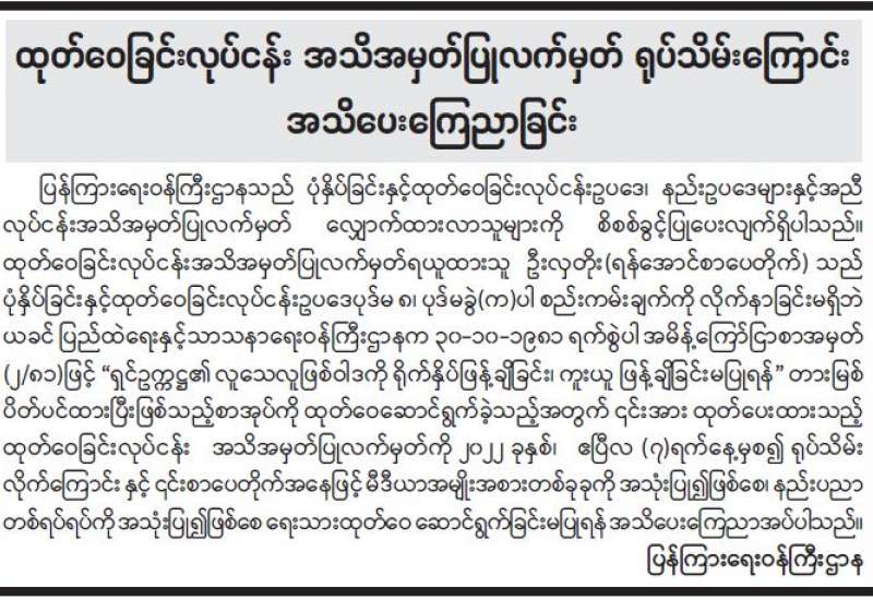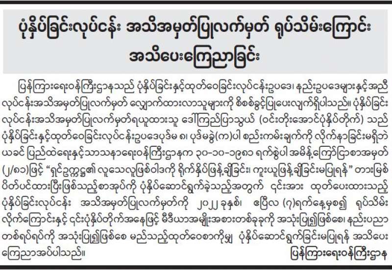 ပုံနှိပ်ခြင်းလုပ်ငန်း အသိအမှတ်ပြုလက်မှတ် ရုပ်သိမ်းကြောင်း အသိပေးကြေညာခြင်း