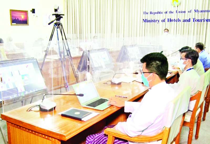 ဟိုတယ်နှင့် ခရီးသွားလာရေးဝန်ကြီးဌာန ပြည်ထောင်စုဝန်ကြီး ဒေါက်တာဌေးအောင်သည် ယနေ့နံနက်ပိုင်းတွင် ဝန်ကြီးဌာန နီလာအစည်း အဝေးခန်းမ၌ Video Conferencing စနစ်ဖြင့် ကျင်းပသည့် ဧည့်စာရင်းစီမံခန့်ခွဲမှုစနစ် လုံခြုံအဆင်ပြေလွယ်ကူစွာ အသုံးပြုနိုင်စေရန် အဆင့်မြှင့်တင် ထားရှိမှုအခြေအနေ ရှင်းလင်းတင်ပြသည့် အစည်းအဝေးသို့ တက်ရောက်သည်။