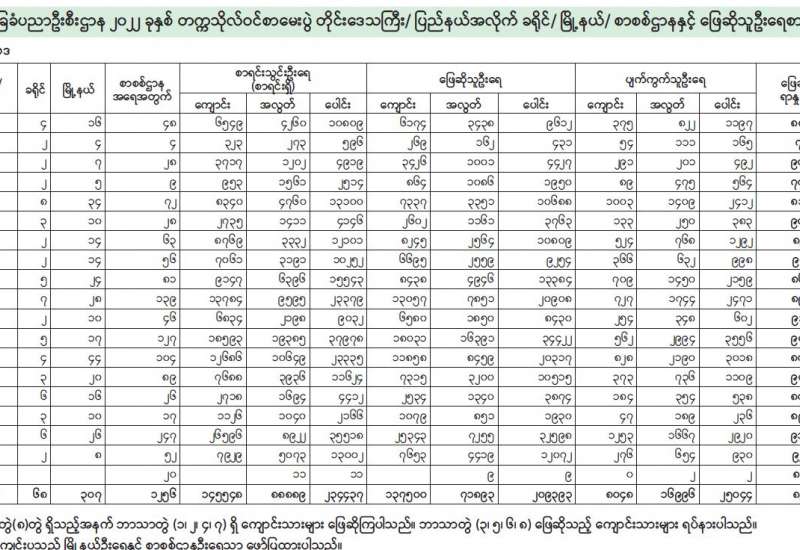 (၆-၄-၂၀၂၂) ရက်နေ့၊ ည (၈:၀၀) နာရီမှ (၇-၄-၂၀၂၂) ရက်နေ့၊ ည (၈:၀၀) နာရီအတွင်း ဓာတ်ခွဲနမူနာစုစုပေါင်း (၁၄,၂၄၆) ခုအား စစ်ဆေးပြီးစီးခဲ့ရာ COVID-19 ရောဂါ ဓာတ်ခွဲအတည်ပြု လူနာသစ် (၅၃) ဦး တွေ့ရှိရပါသည်။ ထို့ကြောင့် ယနေ့အတွက် ရောဂါပိုး တွေ့ရှိမှု ရာခိုင်နှုန်းမှာ (၀.၃၇) ရာခိုင်နှုန်း ရှိပါသည်။