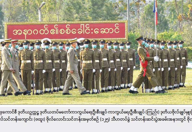 တပ်မတော်(ကြည်း) ဗိုလ်သင် တန်းကျောင်း(ဗထူး) ဗိုလ်လောင်း သင်တန်းအမှတ်စဉ် (၁၂၅) ပြန်တမ်းဝင်အရာရှိ ခန့်အပ်ခြင်း အခမ်းအနားကို ယနေ့နံနက်ပိုင်း က ဗထူးတပ်မြို့ရှိ အဆိုပါ ဗိုလ်သင်တန်းကျောင်း စစ်ရာထူး ခန့်ထားရေး ခန်းမဆောင် (Commissioning Hall) ၌ ကျင်းပရာ ကာကွယ်ရေးဦးစီး ချုပ်ရုံး(ကြည်း)မှ စစ်ရာထူးခန့်ချုပ် ဒုတိယဗိုလ်ချုပ်ကြီး လင်းအောင်၊ ဒုတိယတပ်မတော် လေ့ကျင့်ရေးအရာရှိချုပ် ဗိုလ်ချုပ် အောင်မျိုးသန့်၊ ကျောင်းအုပ်ကြီး ဗိုလ်မှူးချုပ် မျိုးဇော်ဝင်းနှင့် ကျောင်းဆင်း ဗိုလ်လောင်းများ တက်ရောက်ကြသည်။