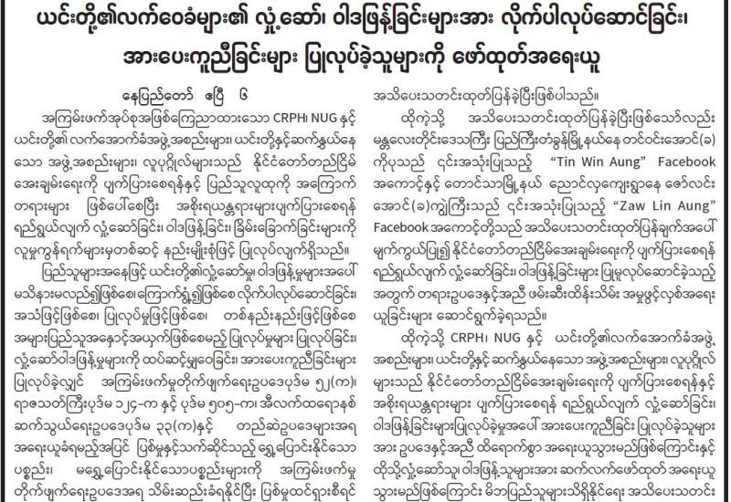 စစ်ကိုင်းတိုင်းဒေသကြီး၊ စစ်ကိုင်းမြို့နယ်၊ ညောင်ငုတ်တိုကျေးရွာရှိ “သစ္စာရွှေဂူ” ဘုန်းတော်ကြီးကျောင်း၌ ဖွင့်လှစ်ထားသည့် “မေတ္တာရိပ်”မိဘမဲ့ဂေဟာမှ စေတနာ့ဝန်ထမ်း ဆရာမတစ်ဦးအား PDF အမည်ခံအကြမ်းဖက်သမားများက သေနတ်ဖြင့် ရက်စက်စွာ ပစ်ခတ်သတ်ဖြတ်ပြီး ကျေးရွာအတွင်းရှိ ပြည်သူများ၏ နေအိမ်များအား မီးရှို့ဖျက်ဆီးခဲ့ကြောင်း သိရသည်။