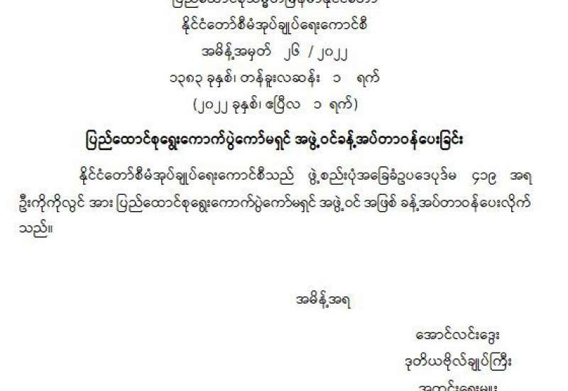 ရွေးကောက်ပွဲအတွက် မဲစာရင်းပြုစုရေးဆိုင်ရာ အစည်းအဝေးကို ယနေ့ညနေပိုင်း တွင် နိုင်ငံတော်စီမံအုပ်ချုပ်ရေးကောင်စီဥက္ကဋ္ဌရုံး အစည်းအဝေးခန်းမ၌ကျင်းပရာ နိုင်ငံတော်စီမံ အုပ်ချုပ်ရေးကောင်စီ ဒုတိယဥက္ကဋ္ဌ ဒုတိယဝန်ကြီးချုပ် ဒုတိယ ဗိုလ်ချုပ်မှူးကြီး စိုးဝင်း တက်ရောက် အမှာစကားပြောကြားသည်။