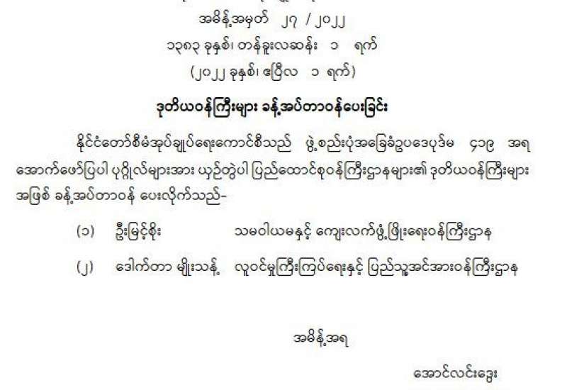 ပြည်ထောင်စုရာထူးဝန်အဖွဲ့၏ (၈၅) နှစ်မြောက် အဖွဲ့စတင်ဖွဲ့စည်းတည်ထောင်သောနေ့ (Foundation Day) အထိမ်းအမှတ်အခမ်းအနားကို ယနေ့ နံနက် ၁၀ နာရီတွင် ပြည်ထောင်စု ရာထူးဝန်အဖွဲ့ စုပေါင်းခန်းမ၌ ကိုဗစ်-၁၉ ကာကွယ်၊ ထိန်းချုပ်၊ ကုသရေး ဗဟိုကော်မတီနှင့် ကျန်းမာရေးဝန်ကြီးဌာနတို့မှ ထုတ်ပြန်ထားသည့် ကိုဗစ်-၁၉ စည်းကမ်းချက်များ၊ သတ်မှတ်ချက်များနှင့် အညီ ကျင်းပသည်။