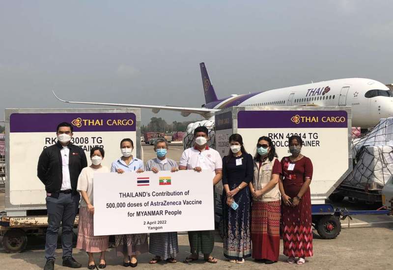 ကိုဗစ်-၁၉ ရောဂါကာကွယ်ဆေးထိုးလုပ်ငန်းများတွင် အသုံးပြုရန် ထိုင်းနိုင်ငံမှ မြန်မာနိုင်ငံ ပြည်သူများသို့ လှူဒါန်းသည့် ကိုဗစ်-၁၉ ကာကွယ်ဆေး AstraZeneca အမှတ်တံဆိပ် (၁)သန်း doses အနက် ဒုတိယအသုတ် ကာကွယ်ဆေး(၅)သိန်း Doses နှင့် ဆေးထိုးအပ် (၅)သိန်းတို့သည် Thai Airways လေယာဉ်ဖြင့် ရန်ကုန်အပြည်ပြည်ဆိုင်ရာ လေဆိပ်သို့ ယနေ့ နံနက် ၉ နာရီ ၁၅ မိနစ်တွင် ရောက်ရှိလာရာ အဆိုပါ ကာကွယ်ဆေးများနှင့် ဆေးထိုးအပ်များကို မြန်မာနိုင်ငံ ကြက်ခြေနီအသင်းသို့ လွှဲပြောင်းပေးအပ်ပွဲကို ရန်ကုန် အပြည်ပြည်ဆိုင်ရာလေဆိပ် ဧည့်ခန်းမဆောင်၌ ပြုလုပ်သည်။