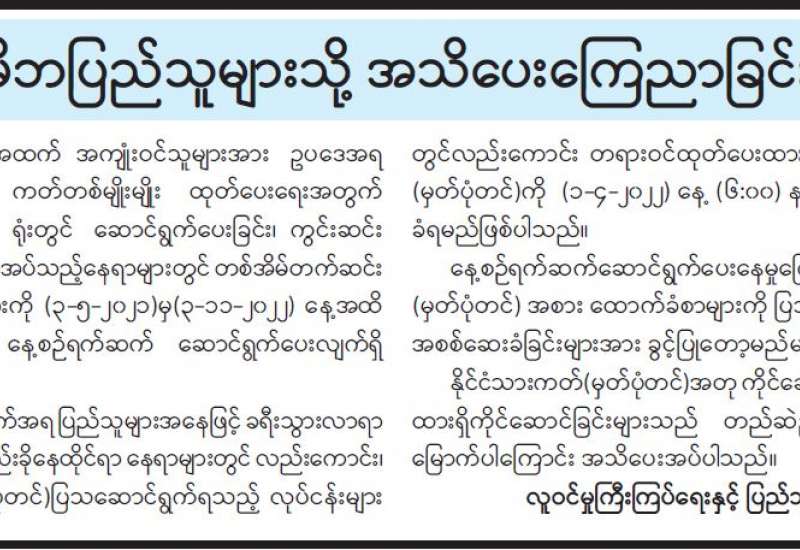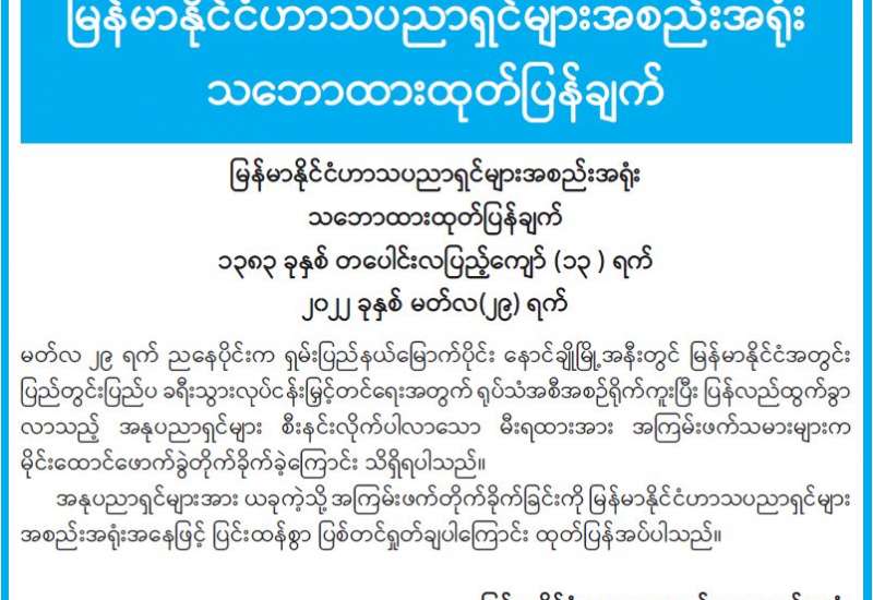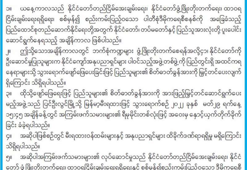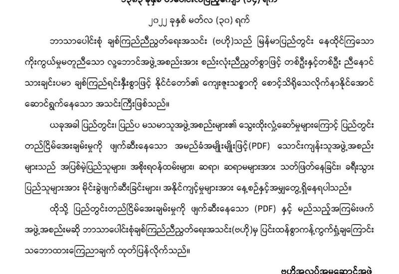 ပြည်တွင်းတည်ငြိမ်အေးချမ်းမှုကို ဖျက်ဆီးနေသော PDF အမည်ခံ သောင်းကျန်းသူများ၏ အကြမ်းဖက် လုပ်ရပ်များကို ပြင်းထန်စွာကန့်ကွက်ရှုတ်ချကြောင်း ဘာသာပေါင်းစုံ ချစ်ကြည်ရေးအသင်း(ဗဟို)က သဘောထားထုတ်ပြန်