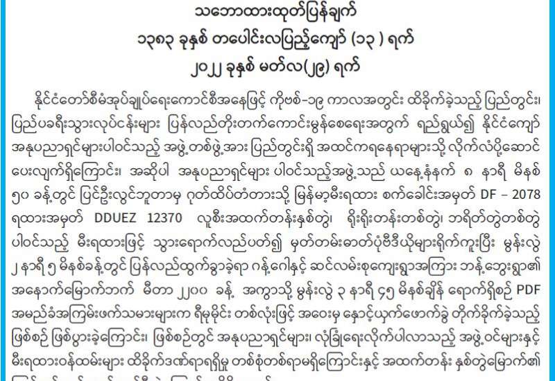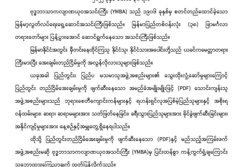 ပြည်တွင်းတည်ငြိမ်အေးချမ်းမှုကို ဖျက်ဆီးနေသော PDF အမည်ခံ သောင်းကျန်းသူများ၏ အကြမ်းဖက် လုပ်ရပ်များကို ပြင်းထန်စွာကန့်ကွက်ရှုတ်ချကြောင်း ဗုဒ္ဓကလျာဏယုဝအသင်းကြီး (YMBA)(ဗဟို)က သဘောထားထုတ်ပြန်