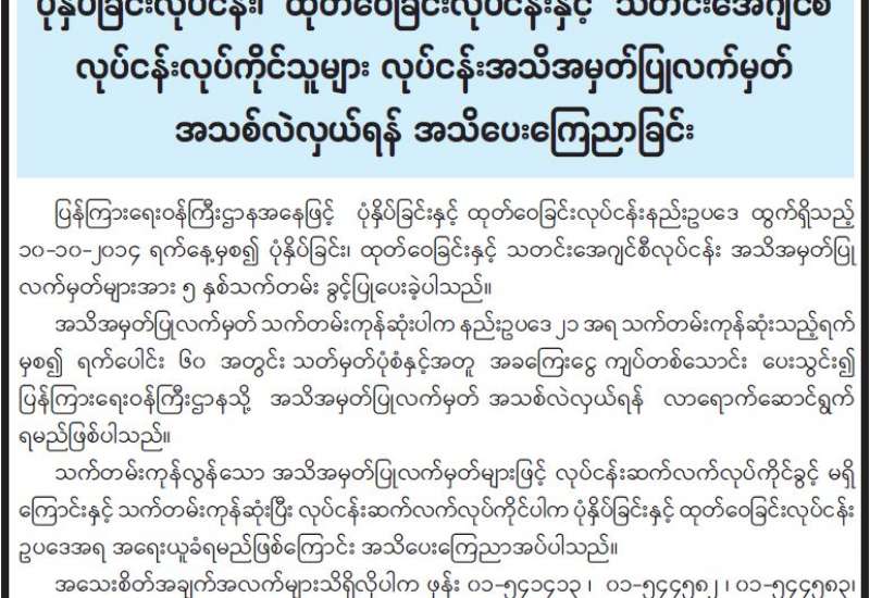 စက်မှုဝန်ကြီးဌာနရှိ အင်ဂျင်နီယာများ၊ နည်းပညာရှင်များ၊ နည်းပညာ ကျွမ်းကျင်သူများ၏ စွမ်းဆောင်ရည် မြှင့်တင်မှုဆိုင်ရာ အလုပ်ရုံဆွေးနွေးပွဲ အခမ်းအနားကို ယနေ့မွန်းလွဲပိုင်းက စက်မှုဝန်ကြီးဌာန ရုံးအမှတ် (၃၀) အစည်းအဝေးခန်းမ၌ ကျင်းပသည်။