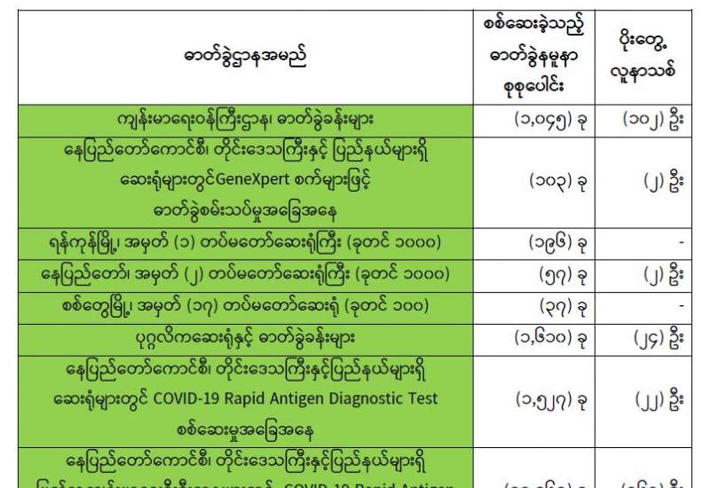 ကျန်းမာရေးဝန်ကြီးဌာနအနေဖြင့် နိုင်ငံအတွင်း ကူးစက်ဖြစ်ပွားနေသော COVID-19 ရောဂါ ကာကွယ်၊ ကုသ၊ ထိန်းချုပ်ရေးလုပ်ငန်းများကို အရှိန်အဟုန်မြှင့် ဆောင်ရွက်လျက်ရှိပါသည်။