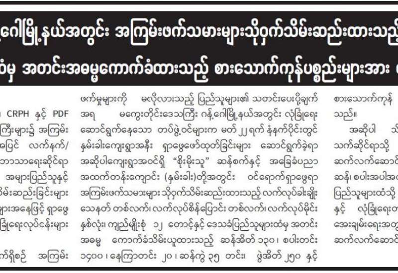 အကြမ်းဖက်အုပ်စုအဖြစ်ကြေငြာထားသော CRPH၊ NUG နှင့် ယင်းတို့၏ လက်အောက်ခံ အဖွဲ့အစည်းများ၊ ယင်းတို့နှင့်ဆက်နွယ်နေသော အဖွဲ့အစည်းများ၊ လူပုဂ္ဂိုလ်များသည် နိုင်ငံတော် တည်ငြိမ်အေးချမ်းရေးကို ပျက်ပြားစေရန်နှင့် ပြည်သူလူထုကို အကြောက်တရားများ ဖြစ်ပေါ်စေပြီး အစိုးရယန္တရားများ ပျက်ပြားစေရန် ရည်ရွယ်လျက် လှုံ့ဆော်ခြင်း၊ ဝါဒဖြန့်ခြင်း၊ ခြိမ်းခြောက်ခြင်းများ ကို လူမှုကွန်ရက်များမှတစ်ဆင့် နည်းမျိုးစုံဖြင့် ပြုလုပ်လျက်ရှိပါသည်။