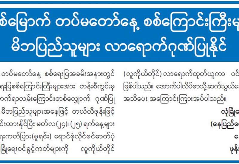 နိုင်ငံတော်စီမံအုပ်ချုပ်ရေးကောင်စီ သတင်းထုတ်ပြန်ရေး အဖွဲ့၏ (၁၂) ကြိမ်မြောက် သတင်းစာ ရှင်းလင်းပွဲကို မတ် ၂၄ ရက် မွန်းလွဲ ၁ နာရီတွင် နေပြည်တော်ရှိ ပြန်ကြားရေးဝန်ကြီးဌာန ဝန်ကြီးရုံး စုပေါင်း အစည်းအဝေးခန်းမ၌ ကျင်းပမည်ဖြစ်ရာ