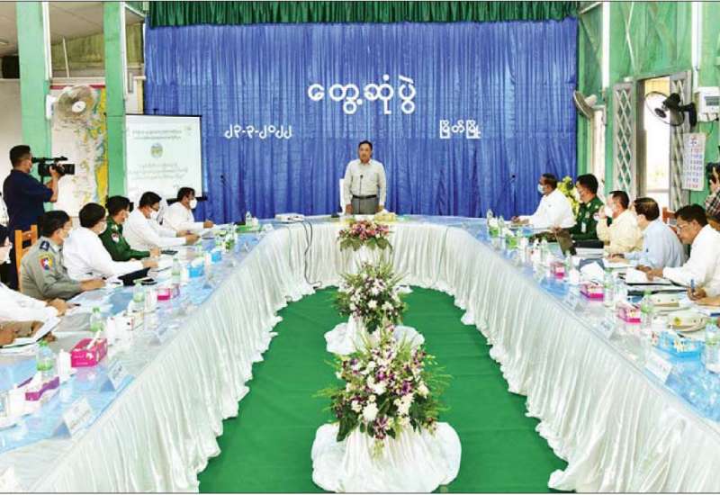 တနင်္သာရီတိုင်းဒေသကြီးသို့ ရောက်ရှိနေသော နိုင်ငံတော်စီမံအုပ်ချုပ်ရေးကောင်စီအဖွဲ့ဝင် ဒုတိယဗိုလ်ချုပ်ကြီး မိုးမြင့်ထွန်းနှင့် အဖွဲ့သည် ယနေ့မွန်းလွဲပိုင်းတွင် မြိတ်ခရိုင် အထွေထွေအုပ်ချုပ်ရေးဦးစီးဌာနရှိ ကျွန်းရတနာ အစည်းအဝေးခန်းမ၌ တနင်္သာရီတိုင်းဒေသကြီး အစိုးရအဖွဲ့ဌာနဆိုင်ရာများနှင့် တွေ့ဆုံသည်။