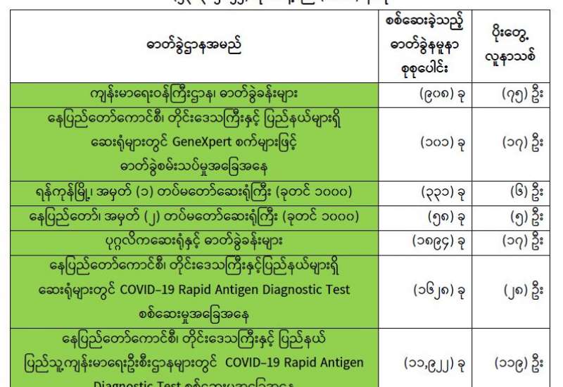 ကျန်းမာရေးဝန်ကြီးဌာနအနေဖြင့် နိုင်ငံအတွင်း ကူးစက်ဖြစ်ပွားနေသော COVID-19 ရောဂါ ကာကွယ်၊ ကုသ၊ ထိန်းချုပ်ရေးလုပ်ငန်းများကို အရှိန်အဟုန်မြှင့်ဆောင်ရွက်လျက်ရှိပါသည်။