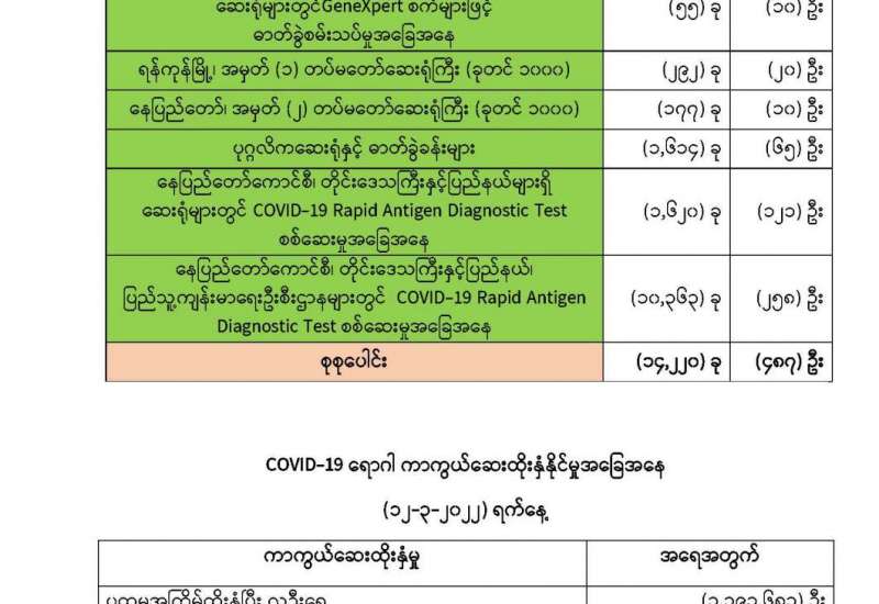 ကျန်းမာရေးဝန်ကြီးဌာနအနေဖြင့် နိုင်ငံအတွင်း ကူးစက်ဖြစ်ပွားနေသော COVID-19 ရောဂါ ကာကွယ်၊ ကုသ၊ ထိန်းချုပ်ရေး လုပ်ငန်းများကို အရှိန်အဟုန်မြှင့်ဆောင်ရွက်လျက်ရှိရာ ရောဂါထိန်းချုပ်ရေးလုပ်ငန်းများ အောင်မြင်နိုင်ရေးအတွက် ပြည်သူလူထု အနေဖြင့် ကျန်းမာရေးဝန်ကြီးဌာနမှ ထုတ်ပြန်ထားသော COVID-19 ရောဂါ ကာကွယ်ထိန်းချုပ်ရေးဆိုင်ရာ စည်းကမ်းများကို စနစ်တကျ လိုက်နာဆောင်ရွက်ရန် လိုအပ်ပြီး COVID-19 ကာကွယ်ဆေးထိုးနှံမှုခံယူခြင်းအား အထူးဂရုပြု ပူးပေါင်းဆောင်ရွက် ကြရန် လိုအပ်ပါသည်။