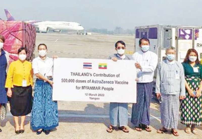 ကိုဗစ်-၁၉ ရောဂါ ကာကွယ်ဆေးထိုးလုပ်ငန်းများတွင် အသုံးပြုရန် ထိုင်းနိုင်ငံမှ မြန်မာနိုင်ငံ ပြည်သူများသို့ မြန်မာနိုင်ငံ ကြက်ခြေနီအသင်းမှ တစ်ဆင့် လှူဒါန်းသည့် ကိုဗစ်-၁၉ ကာကွယ်ဆေး AstraZeneca အမှတ်တံဆိပ် တစ်သန်း doses အနက် ပထမအသုတ် ကာကွယ်ဆေး ငါးသိန်း Doses နှင့် ဆေးထိုးအပ် ငါးသိန်းအား မြန်မာနိုင်ငံကြက်ခြေနီအသင်းသို့ လွှဲပြောင်းပေးအပ်ပွဲကို ယနေ့ နံနက်ပိုင်းက ရန်ကုန်အပြည်ပြည်ဆိုင်ရာ လေဆိပ်ဧည့်ခန်းမဆောင်၌ ပြုလုပ်သည်။
