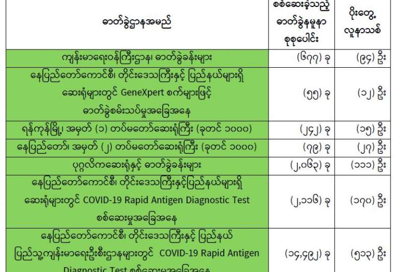 ကျန်းမာရေးဝန်ကြီးဌာနအနေဖြင့် နိုင်ငံအတွင်း ကူးစက်ဖြစ်ပွားနေသော COVID-19 ရောဂါ ကာကွယ်၊ ကုသ၊ ထိန်းချုပ်ရေးလုပ်ငန်းများကို အရှိန်အဟုန်မြှင့် ဆောင်ရွက်လျက်ရှိပါသည်။