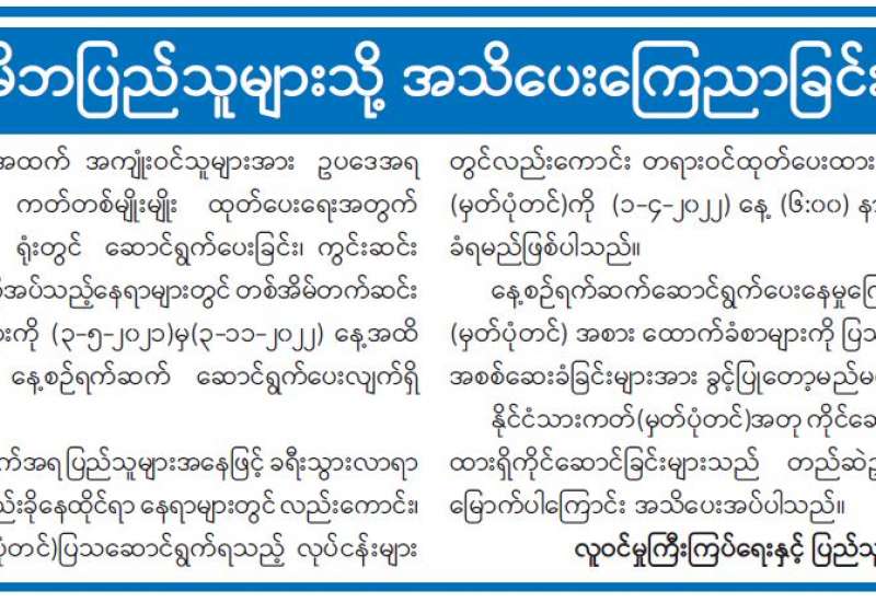 ကျန်းမာရေးဝန်ကြီးဌာနအနေဖြင့် နိုင်ငံအတွင်း ကူးစက်ဖြစ်ပွားနေသော COVID-19 ရောဂါ ကာကွယ်၊ ကုသ၊ ထိန်းချုပ်ရေးလုပ်ငန်းများကို အရှိန်အဟုန်မြှင့် ဆောင်ရွက်လျက်ရှိရာ ရောဂါထိန်းချုပ်ရေးလုပ်ငန်းများ အောင်မြင်နိုင်ရေးအတွက် ပြည်သူလူထုအနေဖြင့် ကျန်းမာရေးဝန်ကြီးဌာနမှ ထုတ်ပြန်ထားသော COVID-19 ရောဂါကာကွယ် ထိန်းချုပ်ရေးဆိုင်ရာ စည်းကမ်းများကို စနစ်တကျလိုက်နာ ဆောင်ရွက်ရန်လိုအပ်ပြီး COVID-19 ကာကွယ်ဆေး ထိုးနှံမှုခံယူခြင်းအား အထူးဂရုပြု ပူးပေါင်းဆောင်ရွက်ကြရန် လိုအပ်ပါသည်။