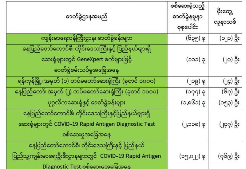 ကျန်းမာရေးဝန်ကြီးဌာနအနေဖြင့် နိုင်ငံအတွင်း ကူးစက်ဖြစ်ပွားနေသော COVID-19 ရောဂါ ကာကွယ်၊ ကုသ၊ ထိန်းချုပ်ရေးလုပ်ငန်းများကို အရှိန်အဟုန်မြှင့် ဆောင်ရွက်လျက်ရှိပါသည်။