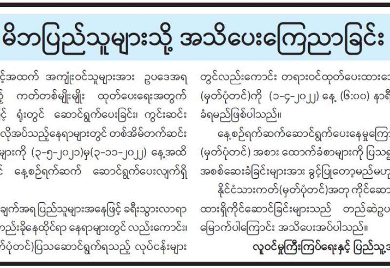 ပြည်ပနိုင်ငံများမှ ဝင်ရောက်လာသည့် မြန်မာနိုင်ငံသားများကို နယ်စပ်ဂိတ် အသီးသီးတွင် လက်ခံဆောင်ရွက်ပေးလျက်ရှိရာ မတ် ၇ ရက်တွင် ရှမ်းပြည်နယ် (မြောက်ပိုင်း)၊ မူဆယ်မြို့သို့ ပြန်လည်ဝင်ရောက်လာသူ အမျိုးသား ၂၈ ဦး၊ အမျိုးသမီး ၄ ဦး၊ စုစုပေါင်း ၃၂ ဦးတို့ကို လက်ခံခဲ့ကြသည်။