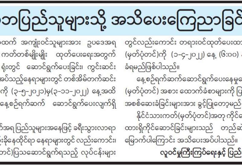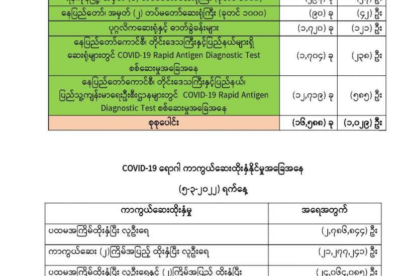 ကျန်းမာရေးဝန်ကြီးဌာနအနေဖြင့် နိုင်ငံအတွင်းကူးစက်ဖြစ်ပွားနေသော COVID-19 ရောဂါ ကာကွယ်၊ ကုသ၊ ထိန်းချုပ်ရေးလုပ်ငန်းများကို အရှိန်အဟုန်မြှင့်ဆောင်ရွက်လျက်ရှိရာ ရောဂါ ထိန်းချုပ်ရေးလုပ်ငန်းများ အောင်မြင်နိုင်ရေးအတွက် ပြည်သူလူထုအနေဖြင့် ကျန်းမာရေး ဝန်ကြီးဌာနမှ ထုတ်ပြန်ထားသော COVID-19 ရောဂါ ကာကွယ်ထိန်းချုပ်ရေးဆိုင်ရာ စည်းကမ်းများကို စနစ်တကျ လိုက်နာဆောင်ရွက်ရန် လိုအပ်ပြီး COVID-19 ကာကွယ်ဆေးထိုးနှံမှုခံယူခြင်းအား အထူးဂရုပြု ပူးပေါင်းဆောင်ရွက်ကြရန် လိုအပ်ပါသည်။