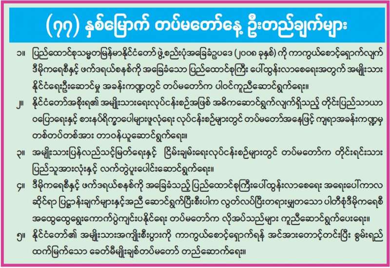 ၂၀၃၀ ပြည့်နှစ်တွင် တစ်နိုင်ငံလုံး လျှပ်စစ်ဓာတ်အားရရှိရေးအတွက် နိုင်ငံတော်က ကြိုးပမ်းဆောင်ရွက် လျက်ရှိသည်။ နိုင်ငံအတွင်း လတ်တလောဖြစ်ပေါ်နေသော ဓာတ်အားပြတ်တောက်မှုများကြောင့် အဆင်မပြေမှုများ ကြုံတွေ့နေရသည့် ပြည်သူများအနေဖြင့် လျှပ်စစ်နှင့် စွမ်းအင်ဝန်ကြီးဌာန၏ ကြိုးပမ်းဆောင်ရွက်နေမှုများ၊ ရင်ဆိုင်ဖြေရှင်းနေရသည့် အခက်အခဲများအပေါ် သိရှိနားလည်စွာဖြင့် တက်ကြွစွာ ပူးပေါင်းဆောင်ရွက်ကြသည်နှင့်အမျှ လာမည့်ရှစ်နှစ်တာကာလတွင် တစ်နိုင်ငံလုံးရှိ အိမ်ထောင်စုများအားလုံး ဓာတ်အားသုံးစွဲခွင့်ရရှိရေးသည် မစားရ၀ခမန်း အပြောသက်သက်မျှသာ မဟုတ်ဘဲ လက်တွေ့အကောင်အထည်ပေါ်လာမည်ဖြစ်သည်။