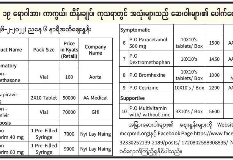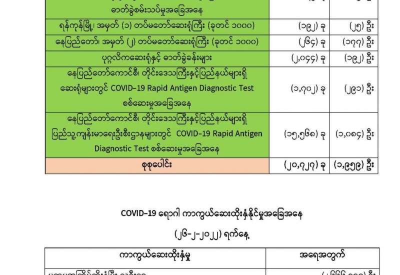 ကျန်းမာရေးဝန်ကြီးဌာနအနေဖြင့် နိုင်ငံအတွင်း ကူးစက်ဖြစ်ပွားနေသော COVID-19 ရောဂါ ကာကွယ်၊ ကုသ၊ ထိန်းချုပ်ရေး လုပ်ငန်းများကို အရှိန်အဟုန်မြှင့်ဆောင်ရွက်လျက်ရှိရာ ရောဂါထိန်းချုပ်ရေး လုပ်ငန်းများ အောင်မြင်နိုင်ရေးအတွက် ပြည်သူလူထု အနေဖြင့် ကျန်းမာရေးဝန်ကြီးဌာနမှ ထုတ်ပြန် ထားသော COVID-19 ရောဂါကာကွယ်ထိန်းချုပ်ရေးဆိုင်ရာ စည်းကမ်းများကို စနစ်တကျလိုက်နာ ဆောင်ရွက်ရန်လိုအပ်ပြီး COVID-19 ကာကွယ်ဆေးထိုးနှံမှုခံယူခြင်းအား အထူးဂရုပြု ပူးပေါင်းဆောင်ရွက်ကြ ရန်လိုအပ်ပါသည်။