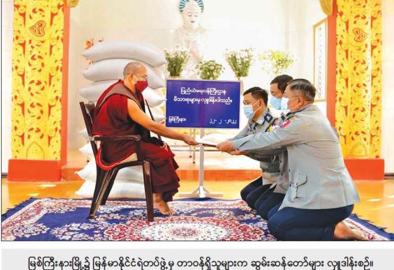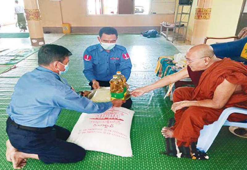 ကိုဗစ်- ၁၉ ရောဂါ ကြိုတင်ကာကွယ်ရေးလုပ်ငန်းများ ဆောင်ရွက်နေသည့်ကာလအတွင်း ဆွမ်း ကိစ္စရပ်များအဆင်ပြေစေရန် ရည်ရွယ်၍ ပြည်ထဲရေးဝန်ကြီးဌာန၊ တပ်ဖွဲ့ဝင်/ဝန်ထမ်း အရာထမ်း၊ အမှုထမ်းမိသားစုများက မြို့နယ်အသီးသီးရှိ ဘုန်းတော်ကြီးကျောင်းများသို့ ဆွမ်းဆန်တော်များ ဆက်ကပ် လှူဒါန်းခြင်းကို ဆောင်ရွက်လျက်ရှိသည်။