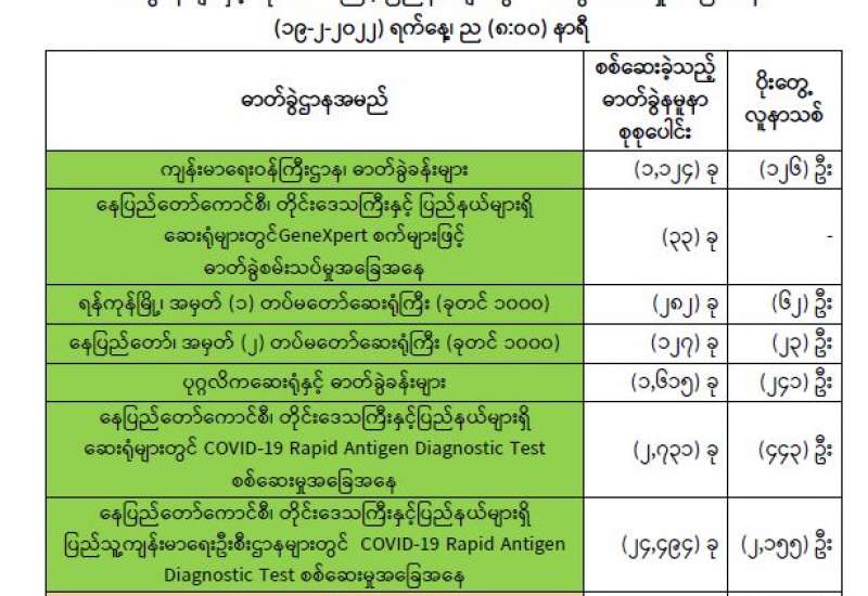 ကျန်းမာရေးဝန်ကြီးဌာနအနေဖြင့် နိုင်ငံအတွင်း ကူးစက်ဖြစ်ပွားနေသော COVID-19 ရောဂါ ကာကွယ်၊ ကုသ၊ ထိန်းချုပ်ရေး လုပ်ငန်း များကို အရှိန်အဟုန်မြှင့် ဆောင်ရွက်လျက်ရှိပါသည်။