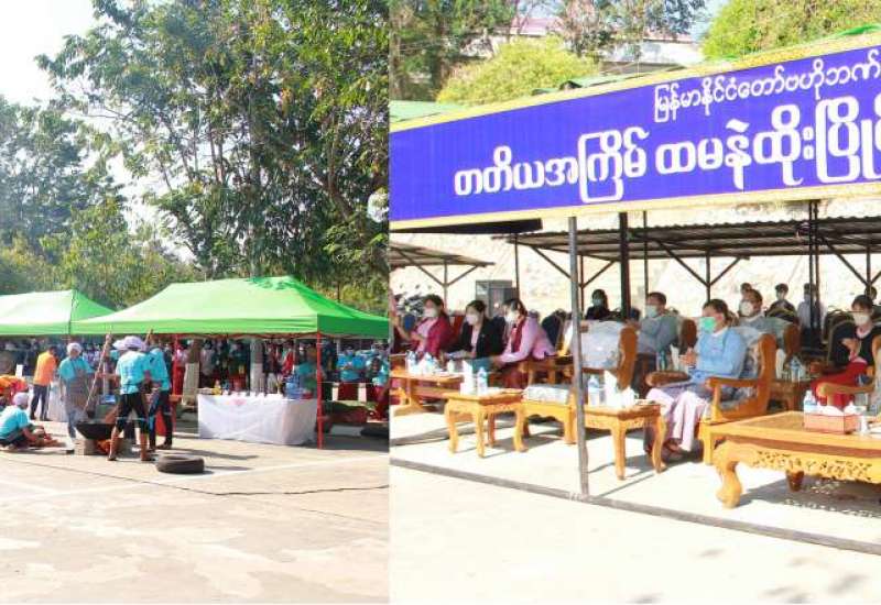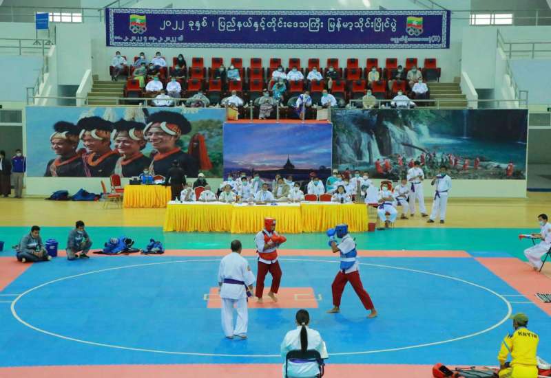 ''၂၀၂၂ ခုနှစ်၊ ပြည်နယ်နှင့်တိုင်းဒေသကြီး မြန်မာ့သိုင်းပြိုင်ပွဲ ပိတ်ပွဲနှင့် ဆုချီးမြှင့်ခြင်းအခမ်းအနား'' ကို ယနေ့တွင် နေပြည်တော် ဝဏ္ဏသိဒ္ဓိအားကစားရုံ (B) ၌ ကိုဗစ်- ၁၉ စည်းကမ်းများနှင့်အညီ ကျင်းပရာ နိုင်ငံတော်စီမံအုပ်ချုပ်ရေးကောင်စီဝင်များဖြစ်ကြသည့် မန်းငြိမ်းမောင်၊ ဒေါ်အေးနုစိန်၊ Jeng Phang နော်တောင်နှင့် ဦးမောင်းဟာ၊ ပြည်ထောင်စုဝန်ကြီးများဖြစ်ကြသည့် ဦးချစ်နိုင်၊ ဒေါက်တာချာလီသန်း၊ ဒေါက်တာမျိုးသိန်းကျော်၊ ဦးမင်းသိန်းဇံ၊ ဦးရွှေလေးနှင့် ဒေါက်တာဌေးအောင် ဒုတိယဝန်ကြီးများနှင့် တာဝန်ရှိသူများ တက်ရောက်ကြည့်ရှုအားပေးကြသည်။