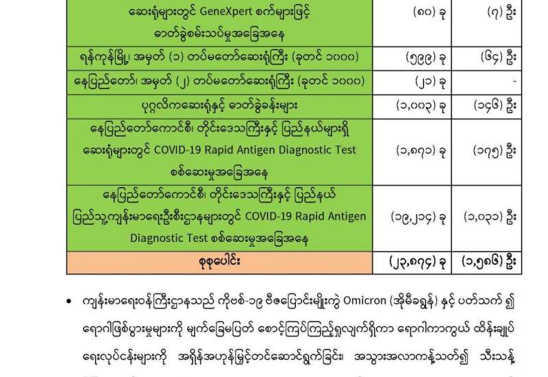 ကျန်းမာရေးဝန်ကြီးဌာနအနေဖြင့် နိုင်ငံအတွင်း ကူးစက်ဖြစ်ပွားနေသော COVID-19 ရောဂါ ကာကွယ်၊ ကုသ၊ ထိန်းချုပ်ရေးလုပ်ငန်းများကို အရှိန်အဟုန်မြှင့် ဆောင်ရွက်လျက်ရှိပါသည်။