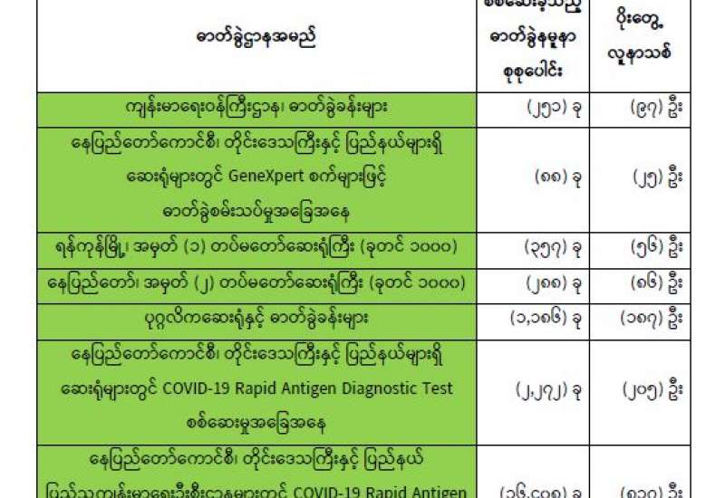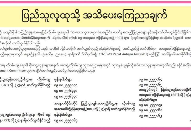 ကျန်းမာရေးဝန်ကြီးဌာနအနေဖြင့် နိုင်ငံအတွင်း ကူးစက်ဖြစ်ပွားနေသော COVID-19 ရောဂါ ကာကွယ်၊ ကုသ၊ ထိန်းချုပ်ရေးလုပ်ငန်းများကို အရှိန်အဟုန် မြှင့်ဆောင်ရွက်လျက်ရှိရာ ရောဂါထိန်းချုပ်ရေးလုပ်ငန်းများ အောင်မြင်နိုင်ရေးအတွက် ပြည်သူလူထုအနေဖြင့် ကျန်းမာရေးဝန်ကြီးဌာနမှ ထုတ်ပြန်ထား သော COVID-19 ရောဂါကာကွယ် ထိန်းချုပ်ရေးဆိုင်ရာ စည်းကမ်းများကို စနစ်တကျ လိုက်နာဆောင်ရွက်ရန်လိုအပ်ပြီး COVID-19 ကာကွယ်ဆေးထိုးနှံမှု ခံယူခြင်းအား အထူးဂရုပြု ပူးပေါင်းဆောင်ရွက်ကြရန် လိုအပ်ပါသည်။