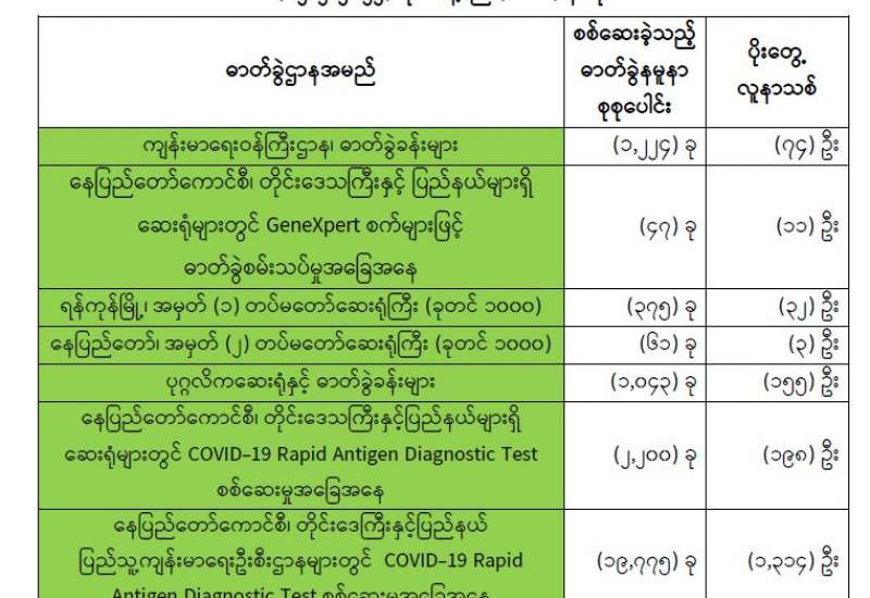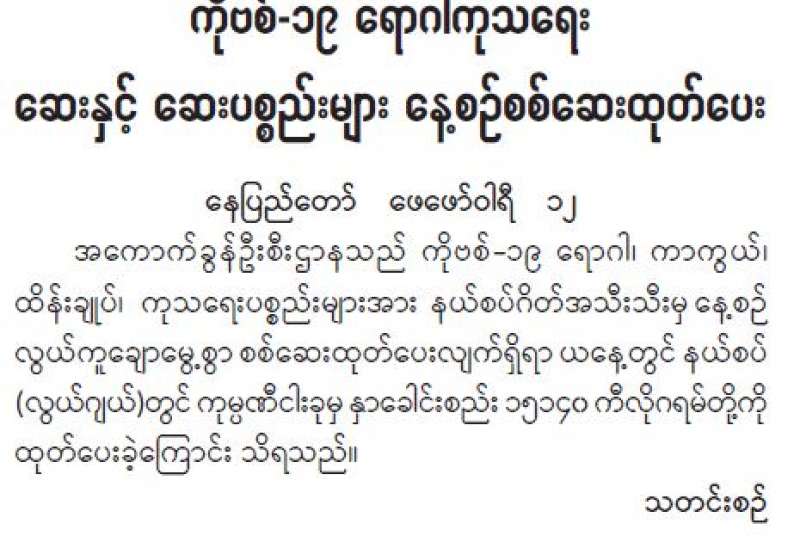 ကျန်းမာရေးဝန်ကြီးဌာနအနေဖြင့် နိုင်ငံအတွင်း ကူးစက်ဖြစ်ပွားနေသော COVID-19 ရောဂါ ကာကွယ်၊ ကုသ၊ ထိန်းချုပ်ရေး လုပ်ငန်းများကို အရှိန်အဟုန်မြှင့် ဆောင်ရွက်လျက်ရှိပါသည်။