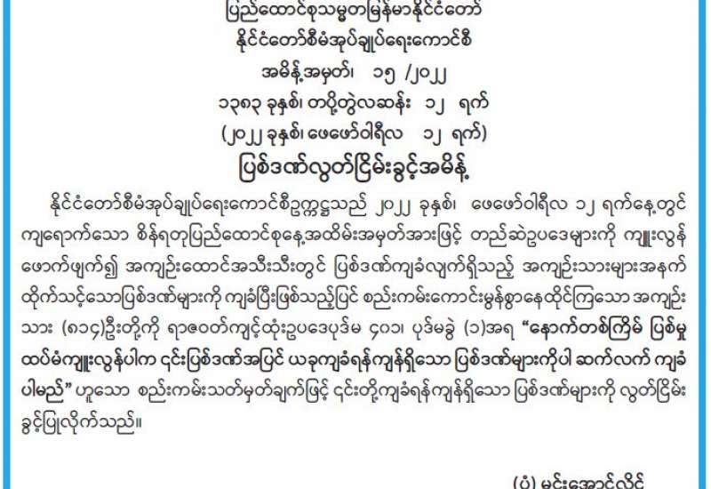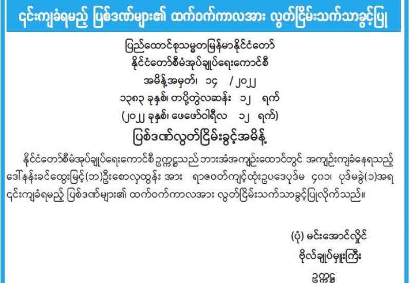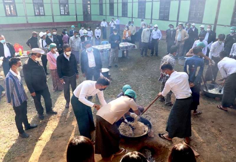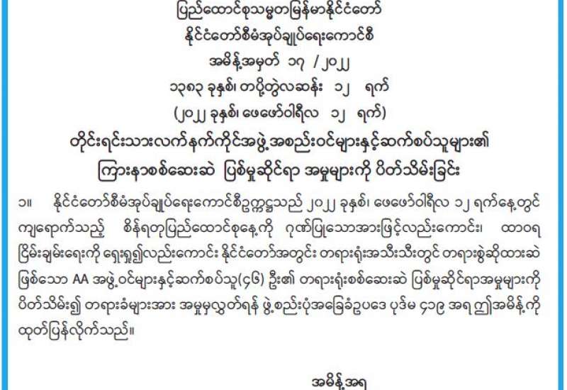(၇၅)နှစ်မြောက် စိန်ရတုပြည်ထောင်စုနေ့ကို ဂုဏ်ပြုသောအားဖြင့် တိုင်းရင်းသားများ၏ လူမှုစီးပွားဘဝပိုမိုဖွံ့ဖြိုးတိုးတက်ရေးအတွက် တိုင်းဒေသကြီး/ပြည်နယ် တိုင်းရင်းသားရေးရာ ဝန်ကြီးများအား တာဝန်ခွဲဝေအပ်နှင်းခြင်းအခမ်းအနားကို ယနေ့နံနက် ၁၀ နာရီခွဲတွင် တိုင်းရင်းသားလူမျိုးများရေးရာဝန်ကြီးဌာန အစည်းအဝေးခန်းမ၌ ကိုဗစ်-၁၉ တားဆီးကာကွယ်ရေး၊ ကျန်းမာရေးဆိုင်ရာ ညွှန်ကြားချက်များနှင့်အညီ ကျင်းပသည်။