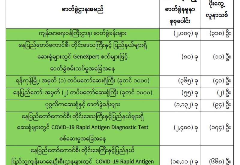 ကျန်းမာရေးဝန်ကြီးဌာနအနေဖြင့် နိုင်ငံအတွင်း ကူးစက်ဖြစ်ပွားနေသော COVID-19 ရောဂါ ကာကွယ်၊ ကုသ၊ ထိန်းချုပ်ရေးလုပ်ငန်းများကို အရှိန်အဟုန်မြှင့် ဆောင်ရွက်လျက်ရှိပါသည်။