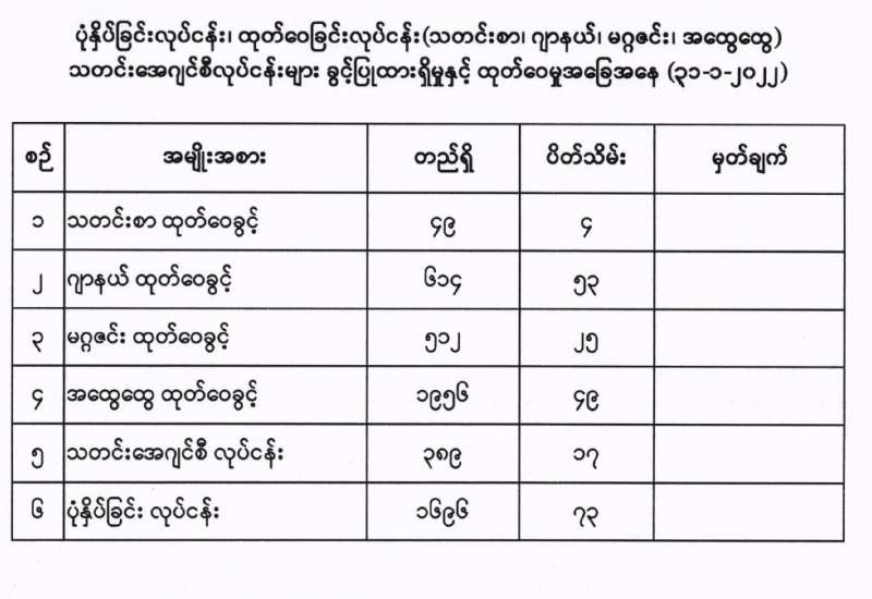 တရားမဝင်ကုန်သွယ်မှုတိုက်ဖျက်ရေး ဦးဆောင်ကော်မတီ၏ ကြီးကြပ်ကွပ်ကဲမှုဖြင့် တရားမဝင် ကုန်သွယ်မှုများကို ဥပဒေနှင့်အညီထိရောက်စွာ တားဆီး အရေးယူနိုင်ရေး ဆောင်ရွက်လျက်ရှိရာ ဖေဖော်ဝါရီ ၇ ရက်တွင် မန္တလေးတိုင်းဒေသကြီး တရားမဝင်ကုန်သွယ်မှု တိုက်ဖျက်ရေး အထူးအဖွဲ့၏ စီမံခန့်ခွဲမှုဖြင့် အမရပူရ ရဲစခန်းမှ ရှောင်တခင် ဝင်ရောက်စစ်ဆေးခဲ့ရာ အမရပူရမြို့နယ်၊ ရွှေကြက်ယက်မှ တရားဝင်စာရွက်စာတမ်း အထောက်အထား တစ်စုံတစ်ရာ တင်ပြနိုင်ခြင်းမရှိသော အိန္ဒိယနိုင်ငံထုတ် ဂျုံမှုန့်အိတ်(၂၄၀)အိတ် (ခန့်မှန်းတန်ဖိုးငွေကျပ် ၇,၂၀၀,၀၀၀)နှင့် ဂျုံမှုန့်အိတ်များ တင်ဆောင်လာသော Fuso အမျိုးအစား ၁၂ ဘီး မော်တော်ယာဉ် (၁)စီး (ခန့်မှန်း တန်ဖိုးငွေကျပ် ၂၂,၀၀၀,၀၀၀) စုစုပေါင်း (ခန့်မှန်းတန်ဖိုးငွေကျပ် ၂၉,၂၀၀,၀၀၀)ကို ဖမ်းဆီးရမိခဲ့ပြီး အကောက်ခွန် ဥပဒေဖြင့် အရေးယူ ဆောင်ရွက်လျက်ရှိသည်။