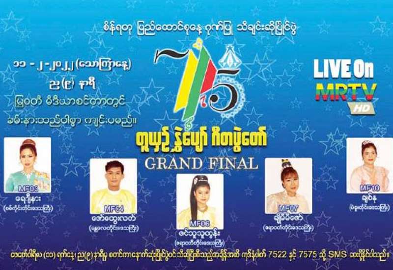စိန်ရတုပြည်ထောင်စုနေ့ကို ဂုဏ်ပြုသောအားဖြင့် “တူယှဉ်နွှဲပျော် ဂီတပွဲတော်” နောက်ဆုံးအဆင့် သီချင်းဆိုပြိုင်ပွဲကို ဖေဖော်ဝါရီ ၁၁ ရက် (သောကြာနေ့)ညတွင် ရန်ကုန်မြို့ ပြည်သာယာရှိမြဝတီမီဒီယာစင်တာတွင် ကျင်းပမည်ဖြစ်ရာ မြန်မာ့ရုပ်မြင်သံကြားမှ တိုက်ရိုက် Live ရိုက်ကူးထုတ်လွှင့်မည်ဖြစ်သည်။