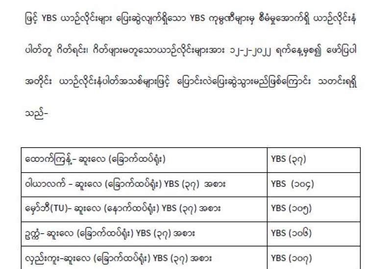 ရန်ကုန်တိုင်းဒေသကြီး ပုဂ္ဂလိကသယ်ယူပို့ဆောင်ရေး ကြီးကြပ်မှုကော်မတီ (YRTC) ကြီးကြပ်မှု ဖြင့် YBS ယာဉ်လိုင်းများ ပြေးဆွဲလျက်ရှိသော YBS ကုမ္ပဏီများမှ စီမံမှုအောက်ရှိ ယာဉ်လိုင်းနံ ပါတ်တူ ဂိတ်ရင်း၊ ဂိတ်ဖျားမတူသောယာဉ်လိုင်းများအား ၁၂-၂-၂၀၂၂ ရက်နေ့မှစ၍ ဖော်ပြပါ အတိုင်း ယာဉ်လိုင်းနံပါတ်အသစ်များဖြင့် ပြောင်းလဲပြေးဆွဲသွားမည်ဖြစ်ကြောင်း သတင်းရရှိသည်-