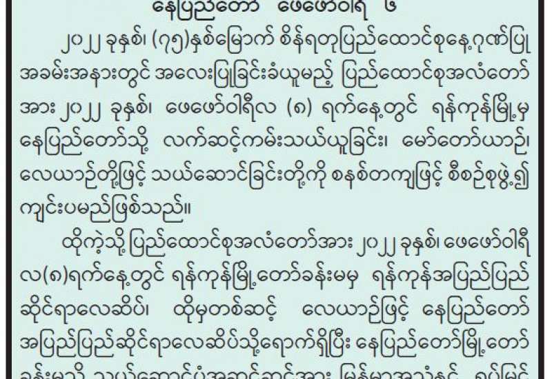 ရန်ကုန်တိုင်းဒေသကြီးအတွင်း ကိုဗစ်-၁၉ ရောဂါ ဖြစ်ပွားမှု ပြန်လည်မြင့်တက်လာသည့်အတွက် အချိန်နှင့်တစ်ပြေးညီ ကာကွယ်ထိန်းချုပ်ကုသရေး ကြိုတင်ပြင်ဆင်မှု လုပ်ငန်းများ ဆောင်ရွက် နေရပြီဖြစ်သည်။ ရန်ကုန်သည် မြန်မာနိုင်ငံတွင် လူဦးရေအထူထပ်ဆုံး၊ စက်မှုဇုန်အများဆုံးဖြစ်၍ စီးပွားရေး အချက်အချာဒေသဖြစ်သလို ကပ်ရောဂါ ကျရောက်ကူးစက် ပျံ့နှံ့မှု အလားအလာ မြင့်မားသော ဒေသလည်းဖြစ်သည်။